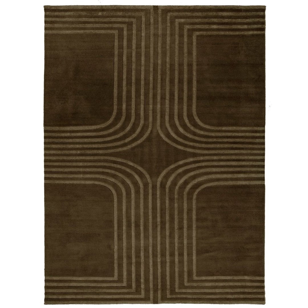Tone-on-tone wool rug with symmetrical carved linework in mocha and bronze—luxurious texture and balance for elegant, minimalist interiors.