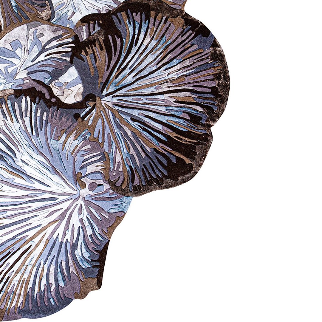 an artful masterpiece that blends organic design with refined craftsmanship. This handmade tufted rug draws inspiration from the natural world, echoing the delicate beauty of blooming fungi or sea corals in motion. The design features layered, overlapping forms with hand-sculpted edges, creating a sense of movement and depth.Crafted using premium NEWZEALAND WOOL , the rug shimmers subtly under light, enhancing its rich texture and visual allure. Shades of deep blue, earthy brown, lavender, slate grey, ivory, and subtle hints of soft aqua come together to form a luxurious, calming palette — ideal for modern, bohemian, or high-end eclectic interiors. Perfect for both floor and wall use, Midnight Bloom is more than a rug — it’s a tactile work of art that anchors any space with sophistication and personality.