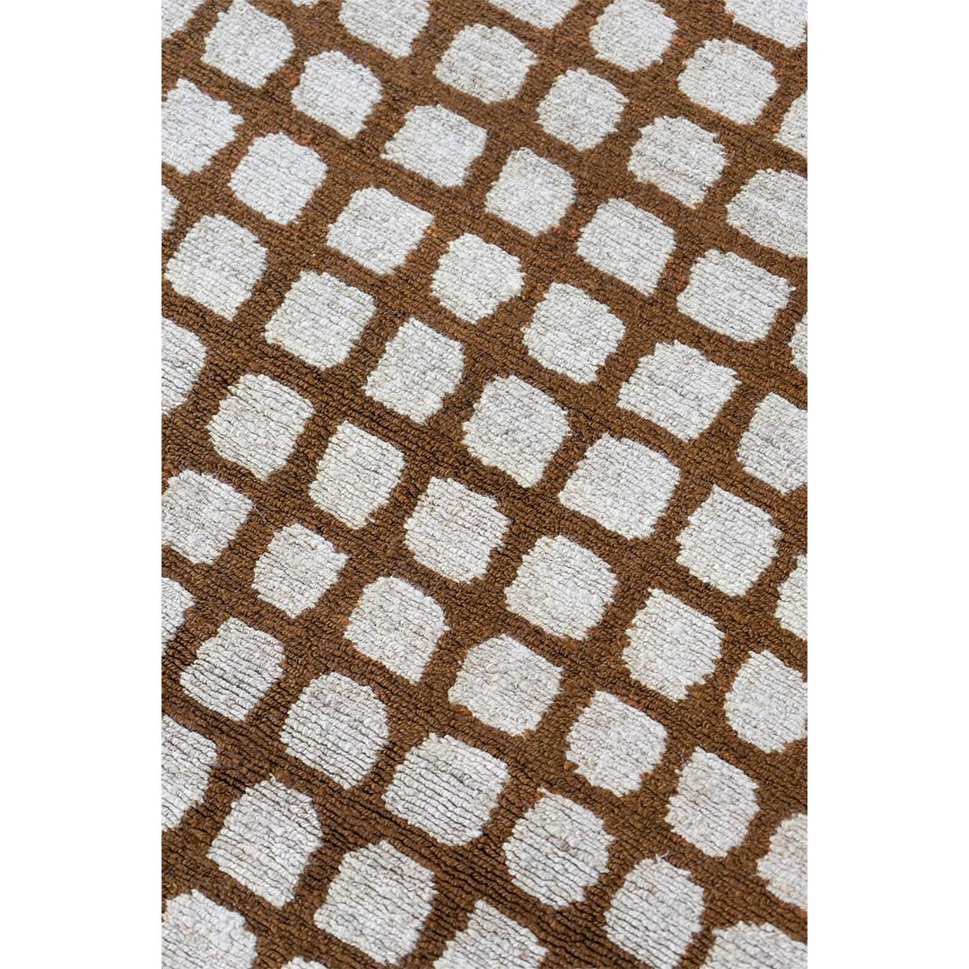 Hand-tufted wool rug with a tactile grid of ivory dots over a rich brown base—modern, textural, and perfect for structured contemporary interiors.