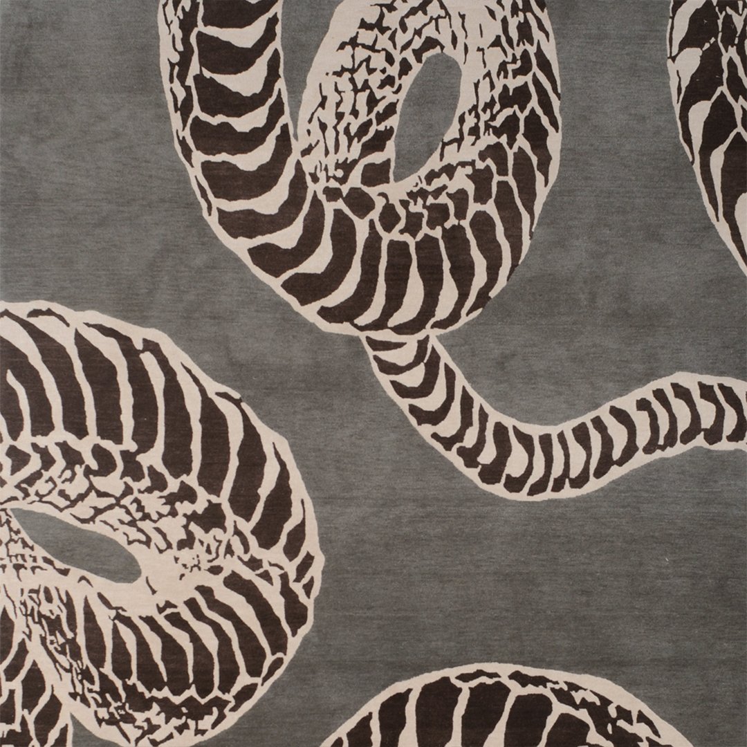 A striking wool rug with coiling black-and-ivory zebra motifs on grey—perfect for edgy, art-forward interiors.